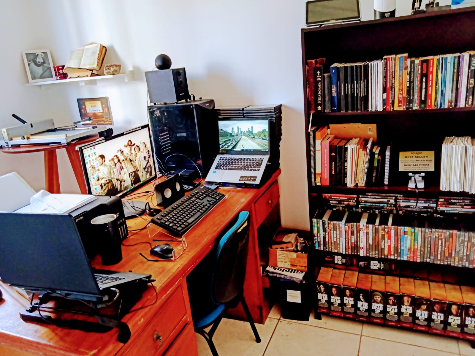 Aqui é o meu local de trabalho, onde passo horas do meu dia produzindo e investindo o meu tempo. Já o chamei de Escritório, Espaço Criativo e Estação de Trabalho. Porém, desde setembro de 2024, uma semana após minha mãe ser recolhida para o Senhor, ele recebeu um novo nome: Escritório Luci C. Marcondes. Com direito a um cartaz, fotos e pertences dela. Uma singela maneira de lembrar e homenagear aquela que sempre acreditou em mim, que investiu e apoiou cada passo do meu caminho, seja como escritor ou como pastor.